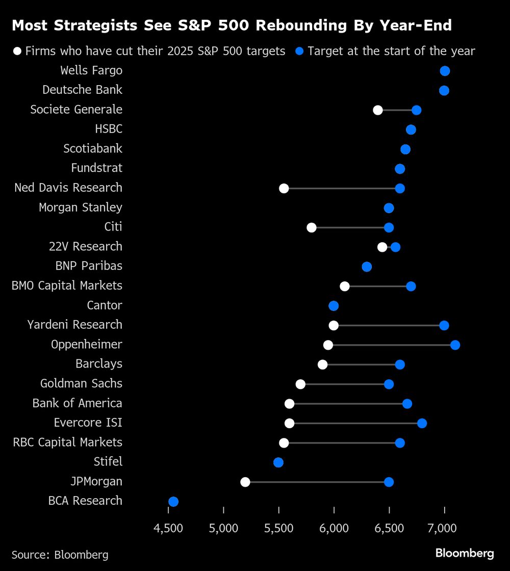 El caos comercial tiene a los pronosticadores bursátiles de todo Wall Street ajustando sus predicciones sobre dónde terminará el S&P 500 en 2025. Subramanian recortó las suyas a 5.600 desde 6.666, y sus colegas de Oppenheimer & Co, Evercore ISI, Goldman Sachs Group Inc, Societe Generale SA y RBC Capital Markets también han recortado las suyas. Ed Clissold, de Ned Davis Research, rebajó su objetivo a 5.550 desde 6.600, reflejando una probabilidad de recesión del 50%.