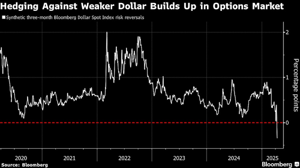 Bloomberg — La demanda de cobertura frente a posibles caídas del dólar ha saltado a su nivel más alto en cinco años, ya que la política arancelaria de la administración Trump amenaza con socavar el excepcionalismo económico de EE.UU. y minar el billete verde.