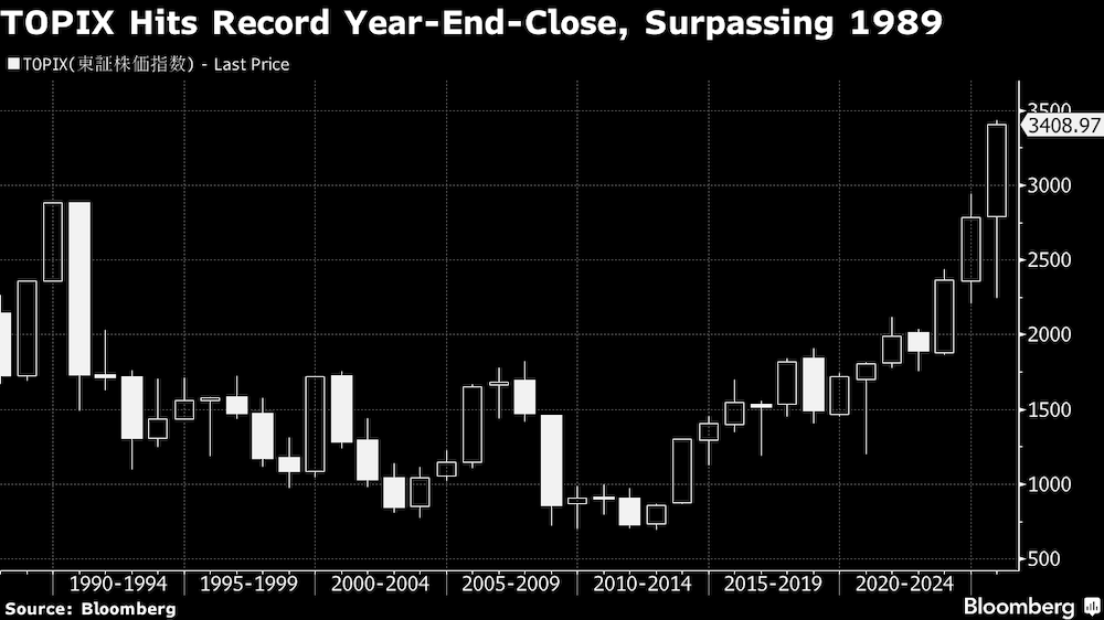 Bloomberg — El índice Topix, de referencia en Japón, cerró el año con un máximo histórico para 2025, superando incluso el pico alcanzado hace 36 años durante la infame burbuja económica.