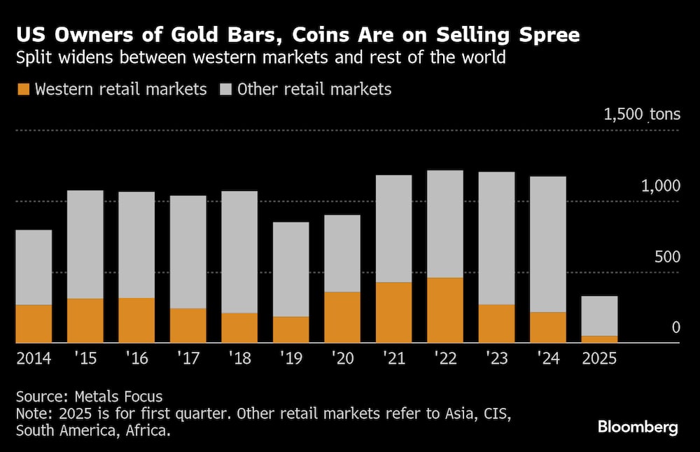 La demanda de lingotes y monedas de oro lleva tres años cayendo en Norteamérica y Europa Occidental mientras aumenta en el resto del mundo, y el año pasado marcó la mayor divergencia registrada en datos que se remontan a 2014, según Metals Focus. Esa diferencia continuó en el primer trimestre de 2025, impulsada sobre todo por la venta masiva en el mercado estadounidense, según la consultora.