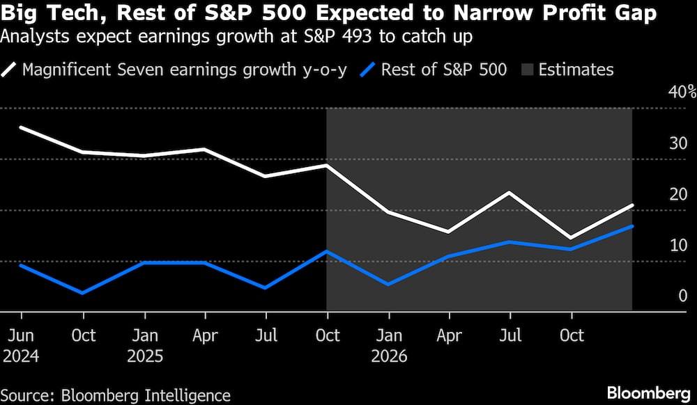 Bloomberg — Algunos de los principales estrategas de Wall Street ven indicios tímidos de que los beneficios en EE.UU. se están expandiendo más allá de los valores tecnológicos de megacapitalización en el corazón del auge de la inteligencia artificial.