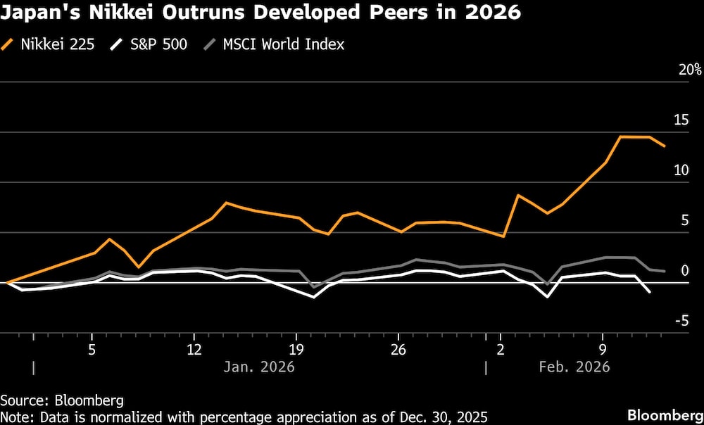Bloomberg — La renta variable japonesa está disfrutando de un comienzo de 2026 arrollador, ya que las políticas de crecimiento de la primera ministra Sanae Takaichi impulsan a los valores, desde los chips hasta la defensa, a lo más alto de las clasificaciones de los mercados desarrollados.