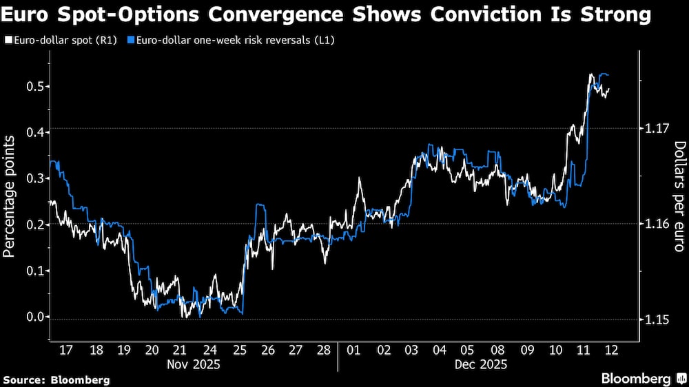 La divisa común está rondando máximos de más de dos meses tras la tercera bajada de tasas consecutiva de la Fed esta semana y los comentarios de línea dura de Isabel Schnabel, miembro del Comité Ejecutivo del BCE. El sentimiento de las opciones ante la decisión del BCE del 18 de diciembre es ahora el más alcista en casi tres meses.