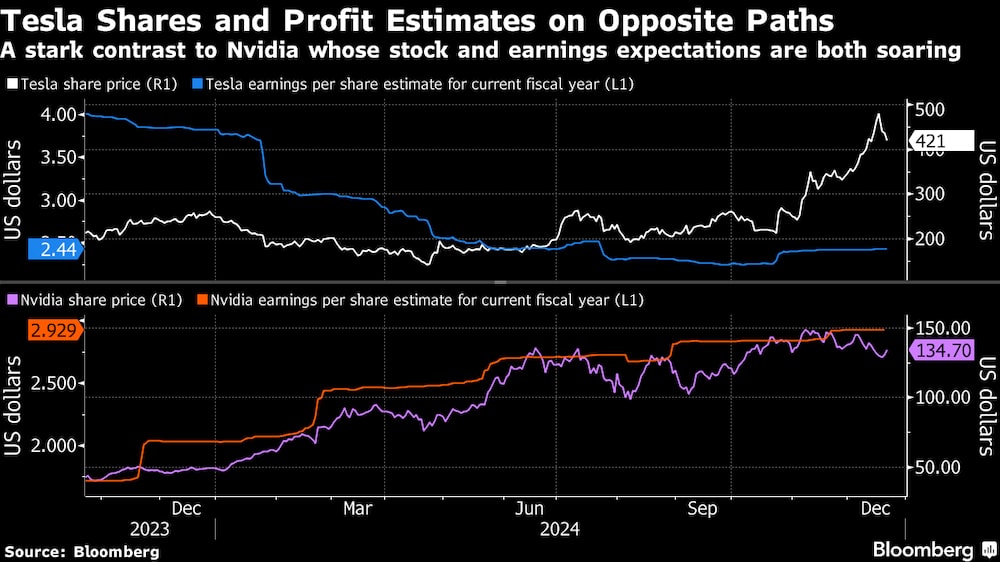 Se puede ver en las valoraciones de los beneficios de la empresa en relación con otro valor al alza: el gigante de los chips de inteligencia artificial Nvidia Corp. (NVDA). Hasta hace poco, Nvidia era considerada la acción más alcista del mercado. Ahora es el turno de Tesla. Pero basándonos en sus ratios precio-beneficios, se trata de dos negocios muy diferentes. Nvidia cotiza actualmente a 32 veces sus beneficios previstos para los próximos 12 meses, Tesla lo hace a 129 veces.
