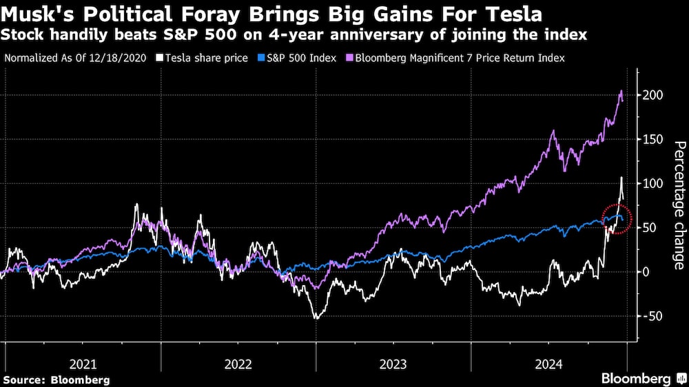 Las teorías sobre la subida parabólica del precio de las acciones de Tesla abundan en Wall Street. Los inversores quieren apostar por el creciente poder de Musk en Washington; el seguimiento masivo de la empresa entre los operadores minoristas está impulsando el movimiento. Y la victoria electoral de Trump puede transformar al fabricante de vehículos eléctricos y ofrecer enormes beneficios futuros.