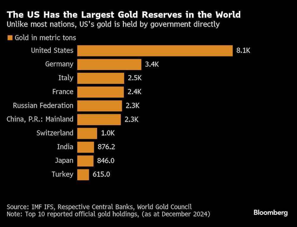 La especulación se centra en la idea de que el Tesoro estadounidense podría volver a colocar sus tenencias de oro a un nivel más alto, un movimiento que generaría dinero rápido para un gobierno deseoso de funcionar de forma más eficiente. En resumen: el gobierno estadounidense debería revalorizar sus reservas de oro desde los US$42 la onza fijados en 1973 hasta los precios actuales, lo que permitiría al Departamento del Tesoro monetizar el repentino aumento del balance de unos US$750.000 millones, reduciendo así la necesidad de emitir bonos.