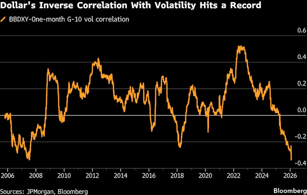 Dado que el dólar ya no es una cobertura fiable contra las caídas de los activos de riesgo, tradicionalmente se fortalecía en tiempos difíciles, eso también significa que los inversores tienen que buscar alternativas. Existe ahora una correlación récord entre el debilitamiento del billete verde y la volatilidad, otra señal de que se avecinan mayores oscilaciones.