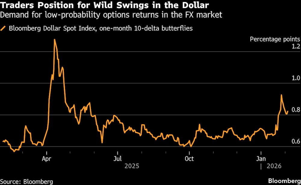 Las apuestas en opciones sobre grandes movimientos del dólar están ahora en su nivel más alto desde abril, cuando los aranceles del “Día de la Liberación” de Trump sacudieron los mercados mundiales. El reciente caos en los metales preciosos también ha hecho subir los indicadores de volatilidad futura en divisas de materias primas como el dólar australiano y la corona noruega.