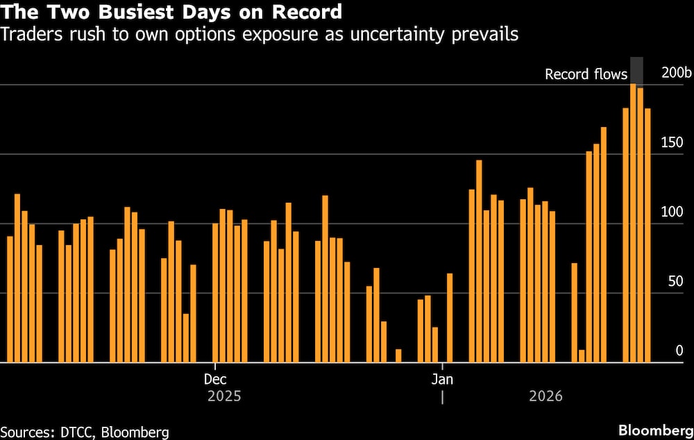 Optiver registró un volumen medio diario de operaciones un 80% superior en enero en comparación con el segundo semestre de 2025. Los datos de la Depository Trust & Clearing Corporation también muestran que los mercados de opciones sobre divisas tuvieron la semana pasada los dos días de mayor actividad de su historia, lo que refleja la fiebre por las coberturas y las apuestas especulativas.