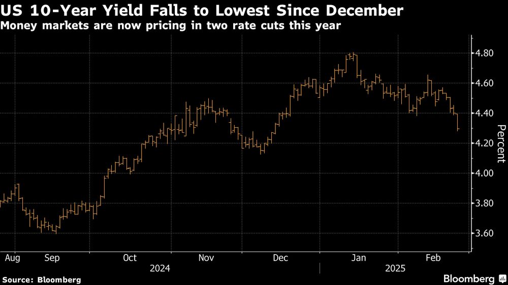 El rendimiento de los bonos del Tesoro a 10 años subió tras una caída de 11 puntos básicos durante la noche, hasta sus niveles más bajos desde mediados de diciembre. Los rendimientos de los bonos australianos y japoneses también cayeron en las primeras operaciones del miércoles. Los mercados monetarios están descontando ahora más de dos reducciones de un cuarto de punto por parte de la Reserva Federal en 2025.