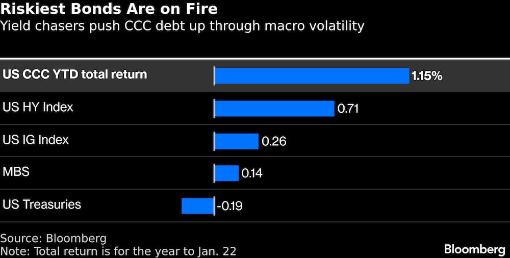 La deuda calificada en el nivel CCC, las calificaciones más bajas que suelen negociarse en EE.UU., ganó un 1,15% este año hasta el cierre del jueves sobre una base de rentabilidad total. Eso es mejor que casi cualquier otro tipo de deuda estadounidense, incluidos otros tipos de bonos basura. Los bonos del Tesoro han bajado alrededor de un 0,2%, según los datos del índice Bloomberg.