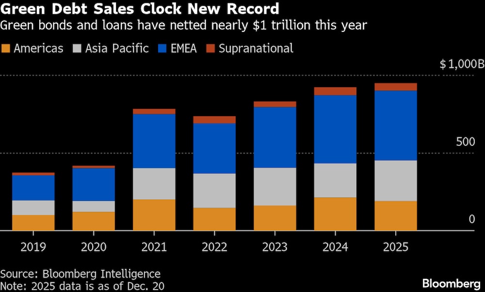 Las empresas de Asia-Pacífico y los emisores vinculados a los gobiernos captaron US$261.000 millones de deuda verde, un 20% más que un año antes, con China e India respaldando el despliegue de las energías renovables, según Bloomberg Intelligence. China alcanzó la cifra récord de US$138.000 millones en emisiones de bonos verdes, encabezadas por sus mayores prestamistas. También estrenó una oferta soberana en Londres a principios de año.