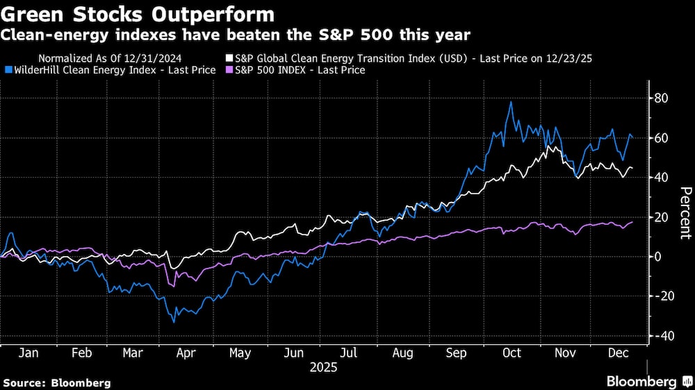 La emisión mundial de bonos y préstamos verdes ha alcanzado la cifra récord de US$947.000 millones en lo que va de año, según datos recopilados por Bloomberg Intelligence. Esto se debe a que los indicadores bursátiles de las energías renovables se disponen a registrar sus primeras ganancias anuales desde 2020, superando al S&P 500 por un amplio margen, mientras que las acciones de las empresas de tecnología de redes eléctricas siguen gozando de favor.