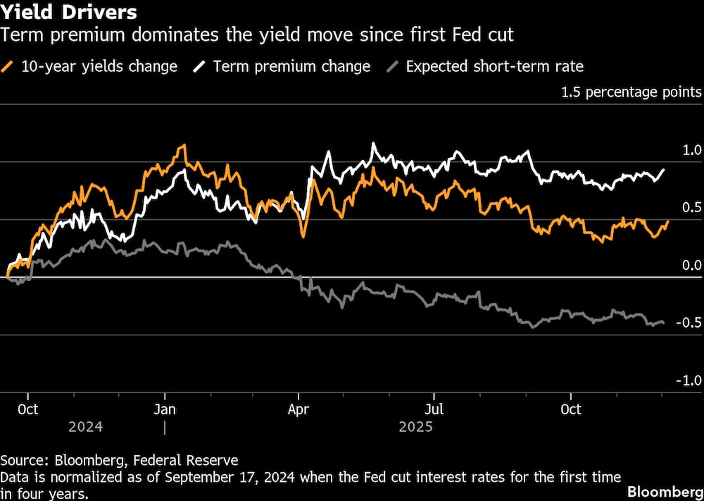 Eso les compensa de los riesgos potenciales a largo plazo, como una inflación elevada o una carga de deuda federal insostenible. Y esa prima ha subido casi un punto porcentual desde que comenzó el ciclo de recortes de tipos, según las estimaciones de la Fed de Nueva York.