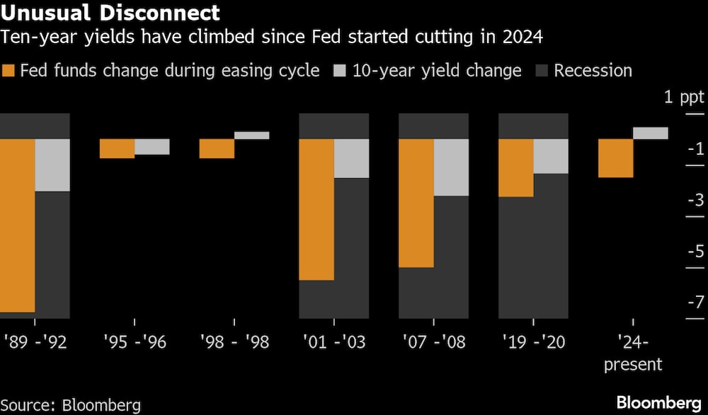 Bloomberg — La reacción del mercado de bonos a los recortes de tipos de interés de la Reserva Federal ha sido sumamente inusual. Al menos en ese punto, existe un amplio consenso en Wall Street. Según algunos indicadores, una desconexión como esta, con los rendimientos de los bonos del Tesoro subiendo a medida que el banco central baja los tipos, no se ha visto desde la década de 1990.