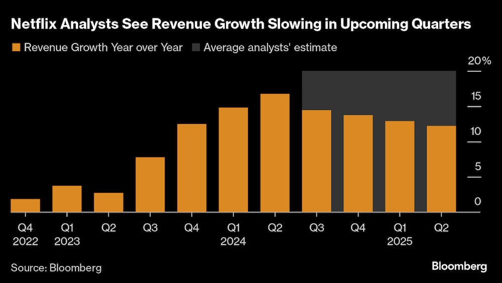 Se espera que Netflix informe un crecimiento de los ingresos del 14% en el tercer trimestre, seguido de una desaceleración gradual durante los próximos tres períodos. Eso es menor que el pico de crecimiento del 17% del trimestre pasado. Las ventas y los ingresos promedio por miembro se han convertido en métricas clave para la empresa después de su cambio de modelo de negocios para ofrecer múltiples niveles de precios.