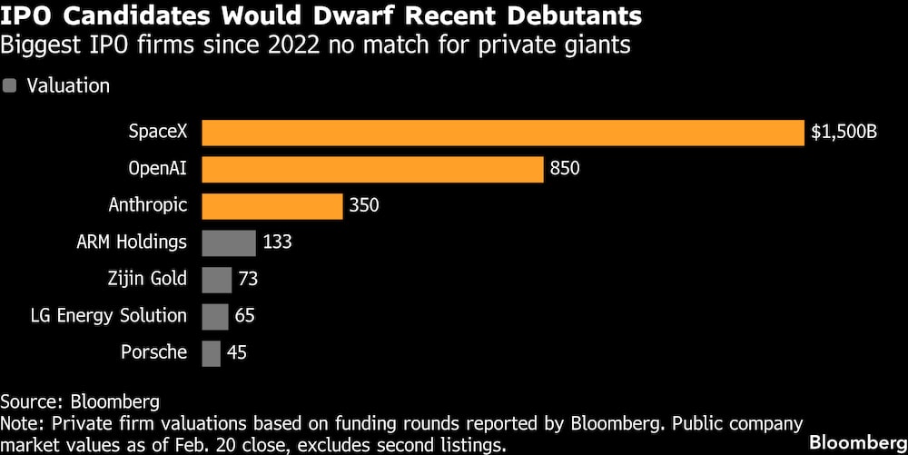 Con el fabricante de cohetes y satélites de Musk apuntando a un debut en junio, esta y otras operaciones potencialmente masivas amenazan con dominar la atención de los inversores y presionar a las empresas que sopesan salidas a bolsa de tamaño relativamente normal para que trabajen a su alrededor.