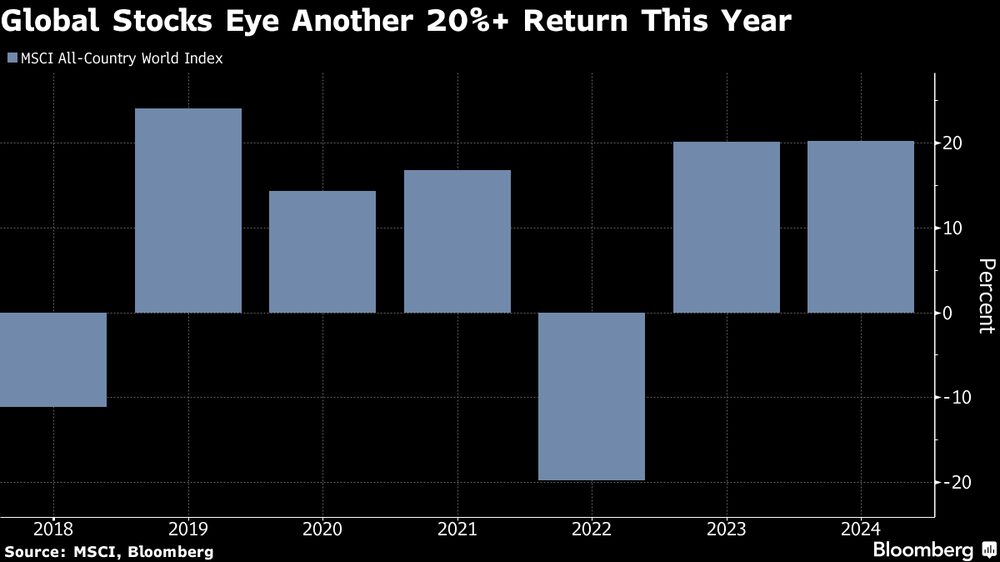 Los inversores se preparan esta semana para una última avalancha de decisiones de los bancos centrales de cuatro continentes, una reunión clave de funcionarios chinos y los datos de inflación de EE.UU., en un esfuerzo por apuntalar los rendimientos del año y ayudar a orientar las posiciones hacia 2025. Según los datos recopilados por Bloomberg, un indicador de la renta variable mundial ha obtenido más de un 20% de rentabilidad este año, camino de obtener su segunda rentabilidad superior consecutiva.