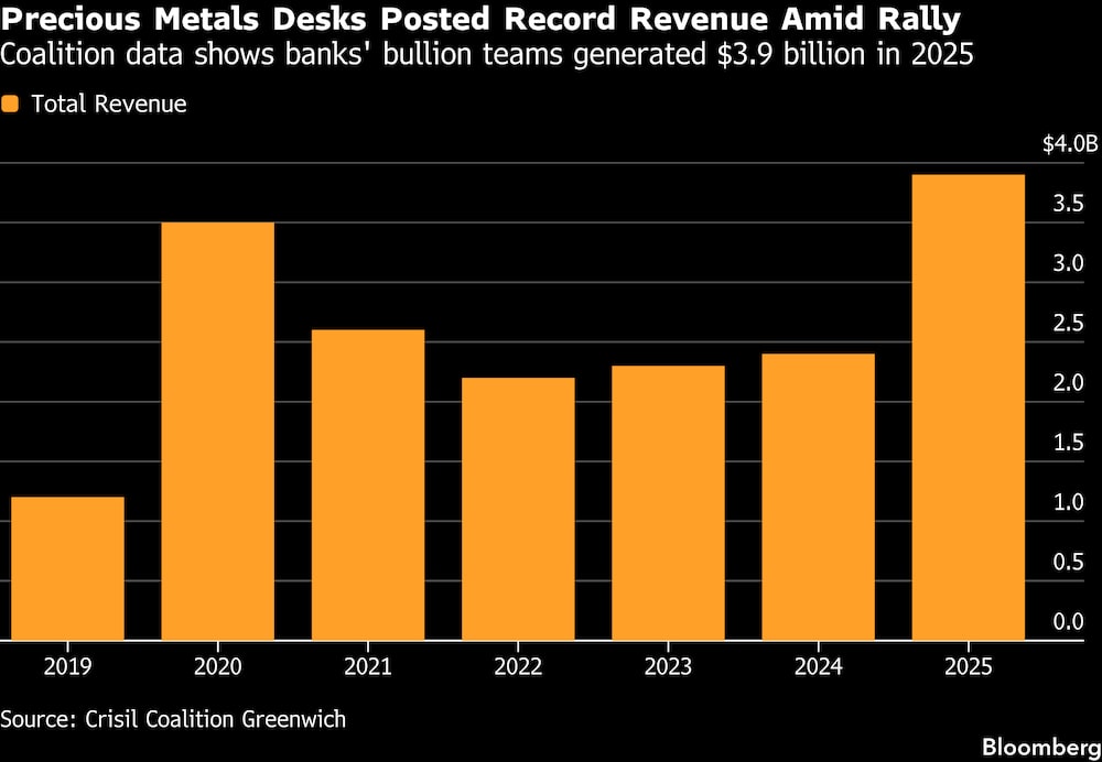 A nivel mundial, las mesas de metales preciosos de los bancos obtuvieron unos ingresos estimados de 3.900 millones de dólares el año pasado, la cantidad más alta de una serie que se remonta a una década, según el proveedor de análisis de servicios financieros Crisil Coalition Greenwich.