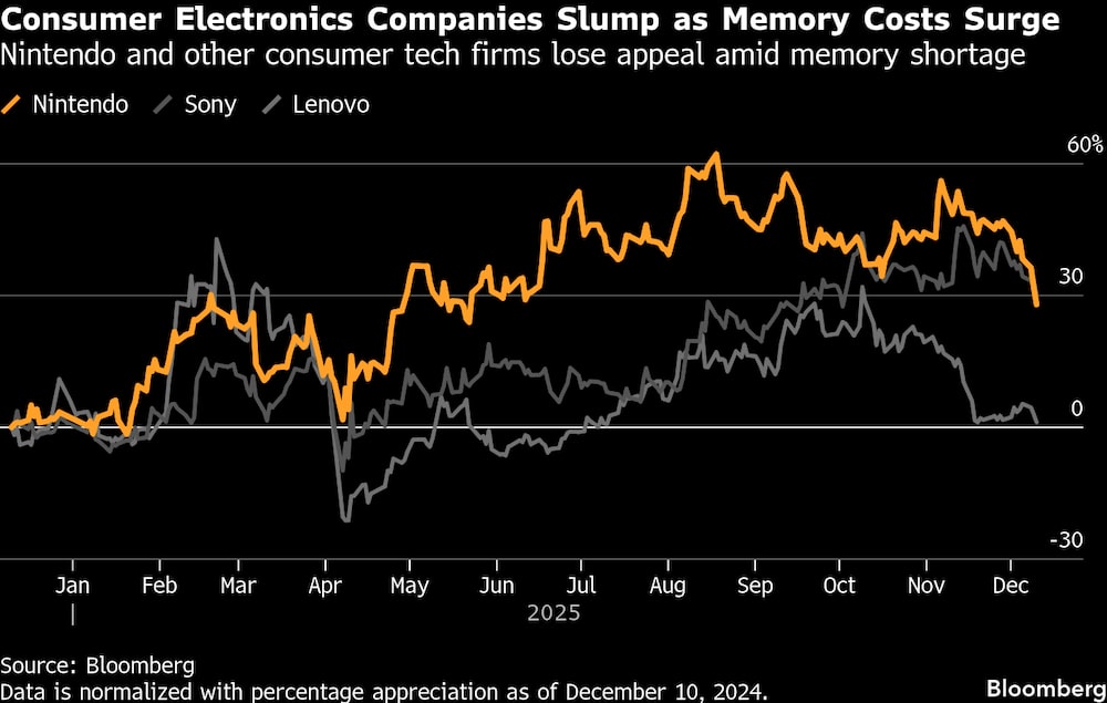 Las acciones de Nintendo han bajado en siete de las ocho jornadas bursátiles de diciembre, perdiendo cerca de US$14.000 millones en valor de mercado, a medida que se desvanece el optimismo sobre la Switch 2 ante la creciente crisis de suministro de memoria. Fabricantes de PC como Dell Technologies Inc. (DELL) y HP Inc. (HPQ) han advertido de que podrían tener que plantearse subidas de precios el año que viene, ya que los costes de los componentes aumentan a un ritmo sin precedentes.