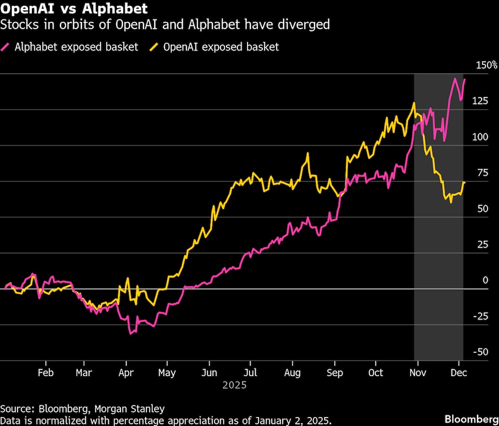 Como resultado, las acciones de las empresas en la órbita de OpenAI —en especial Oracle (ORCL), CoreWeave (CRWV) y Advanced Micro Devices (AMD), pero también Microsoft (MSFT), Nvidia (NVDA) y SoftBank (SFTBY), que tiene una participación del 11% en la empresa— están sufriendo una fuerte presión vendedora. Mientras tanto, el impulso de Alphabet está impulsado no sólo el precio de sus acciones, sino también el de aquellas con las que está asociada, como Broadcom Inc, Lumentum Holdings Inc, Celestica Inc y TTM Technologies Inc.