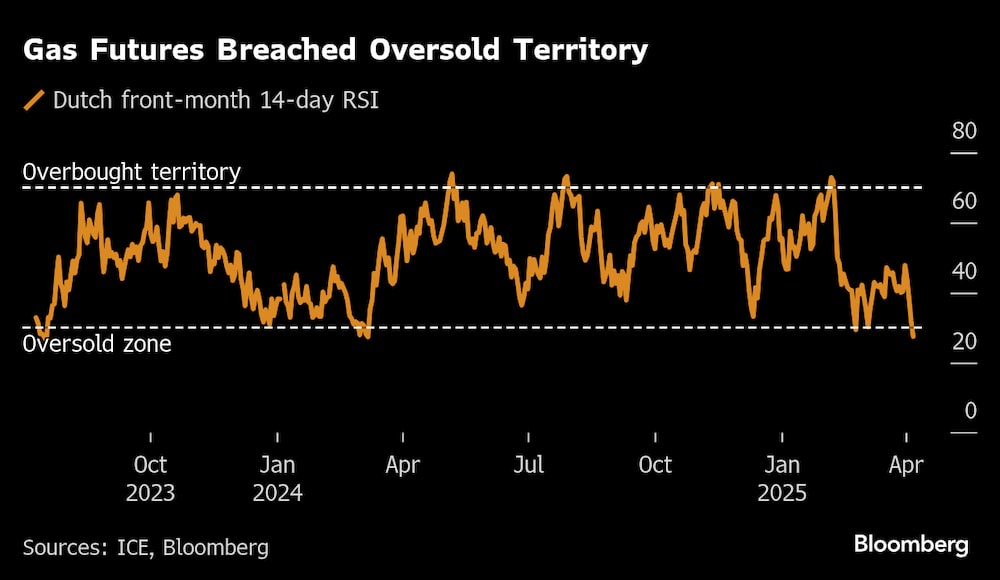 Los futuros holandeses del mes anterior, la referencia europea del gas, cayeron hasta los euros por megavatio-hora a las 8:38 de la mañana en Ámsterdam. La caída situó a los futuros en territorio de sobreventa.