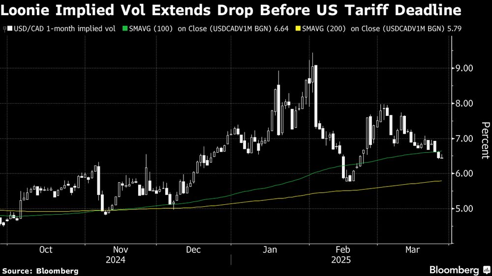 Con más del 75% de las exportaciones canadienses con destino a EE.UU., las amenazas de Trump de imponer aranceles del 25% a los productos canadienses provocaron una subida salvaje del loonie. La volatilidad implícita a un mes para el dólar-loonie cerró en el 7,85% el 28 de enero -una semana antes de que Trump retrasara el arancel un mes- y en el 7,59% el 25 de febrero, una semana antes de que el presidente eximiera de gravámenes comerciales a los bienes mexicanos y canadienses cubiertos por el acuerdo de libre comercio USMCA.