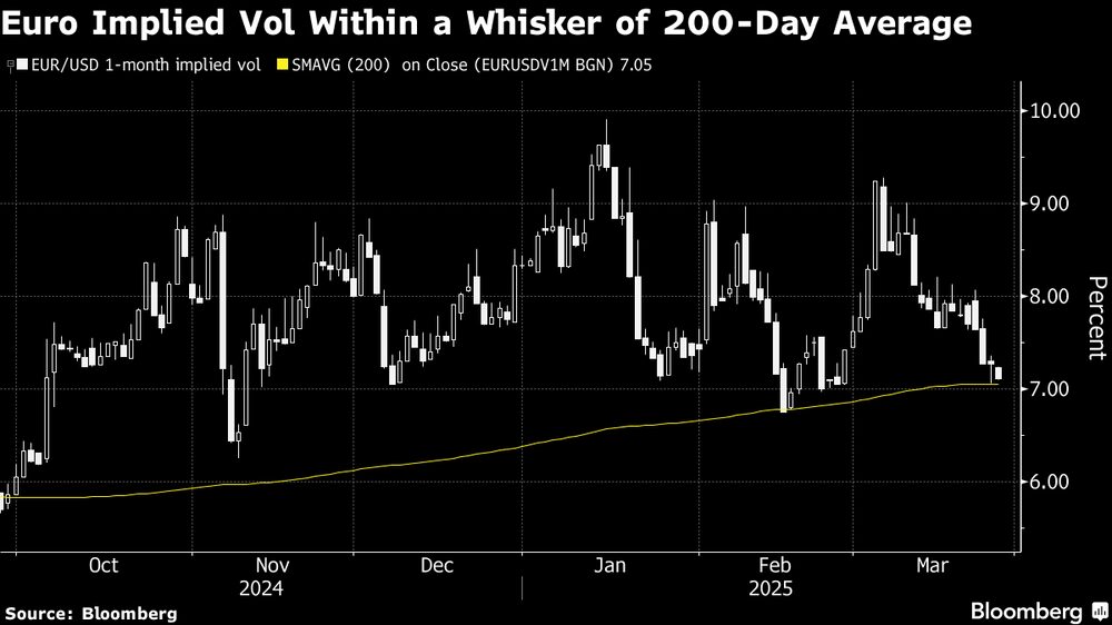 Bloomberg — Los operadores que habían apostado por fuertes oscilaciones en el mercado de divisas de US$7,5 billones al día en torno a los dos últimos plazos arancelarios de Donald Trump están adoptando un nuevo enfoque mientras el presidente promete un ajuste de cuentas comercial para el 2 de abril.
