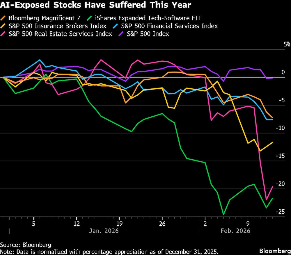 Uno es que la IA está a punto de trastornar segmentos enteros de la economía de forma tan drástica que los inversores se están deshaciendo de las acciones de cualquier empresa que se vea en el más mínimo riesgo de ser desplazada por la tecnología.