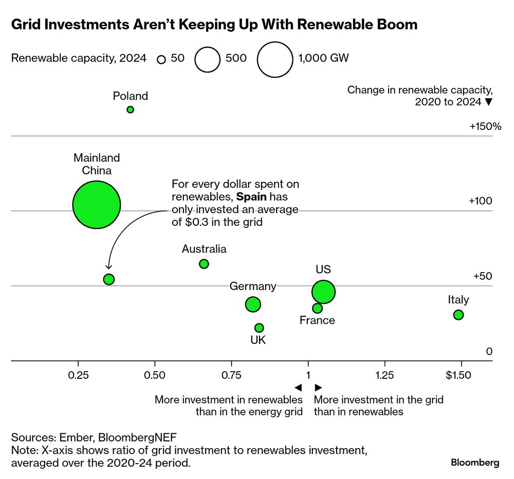 En aquel momento, Entso-E ya había pedido que las redes europeas reforzaran su resistencia en este tipo de situaciones. Los países de la UE y el Reino Unido no invierten lo suficiente en sus redes en relación con lo que gastan en energías renovables, según BloombergNEF. Gastan una media de US$0,7 en redes por cada dólar que destinan a energía limpia, siendo España el país que menos gasta: solo US$0,3 por cada dólar.