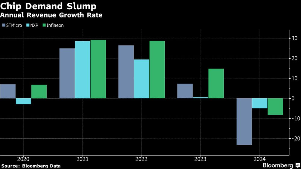 Las cautelosas previsiones de la empresa alemana del martes —que un tipo de cambio favorable y un aumento de la cuota de mercado en China podrían conducir a un ligero repunte de los ingresos este año en lugar de una caída— hicieron que las acciones subieran a su nivel más alto en nueve meses. Las expectativas eran bajas tras una serie de resultados decepcionantes de sus competidores. El fabricante de chips holandés NXP Semiconductors NV (NXPI), su rival franco-italiano STMicroelectronics NV y la estadounidense Texas Instruments Inc. (TXN) no alcanzaron las estimaciones de los analistas, mientras la caída de la industria se prolonga hasta su segundo año.