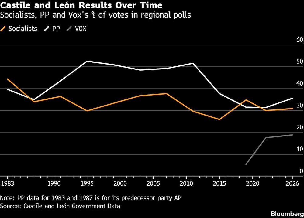 El Partido Popular, o PP, obtuvo el domingo 33 escaños en la legislatura de Castilla y León, compuesta por 82 diputados, frente a los 31 de 2022, según datos del gobierno local con el 96% de los votos escrutados. Los socialistas se hicieron con 30 escaños, frente a los 28 de hace cuatro años, mientras que el tercer puesto fue para los nacionalistas de Vox con 14, un aumento de un escaño.