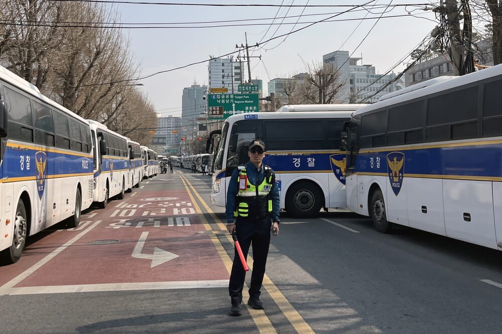 La zona es popular entre los turistas, y las autoridades estaban estableciendo un muro de autobuses policiales para impedir que los manifestantes llegaran al tribunal. Se espera que cientos de miles de manifestantes se reúnan en el centro de Seúl el viernes, según YTN.