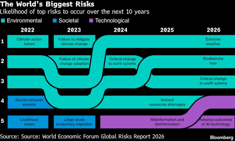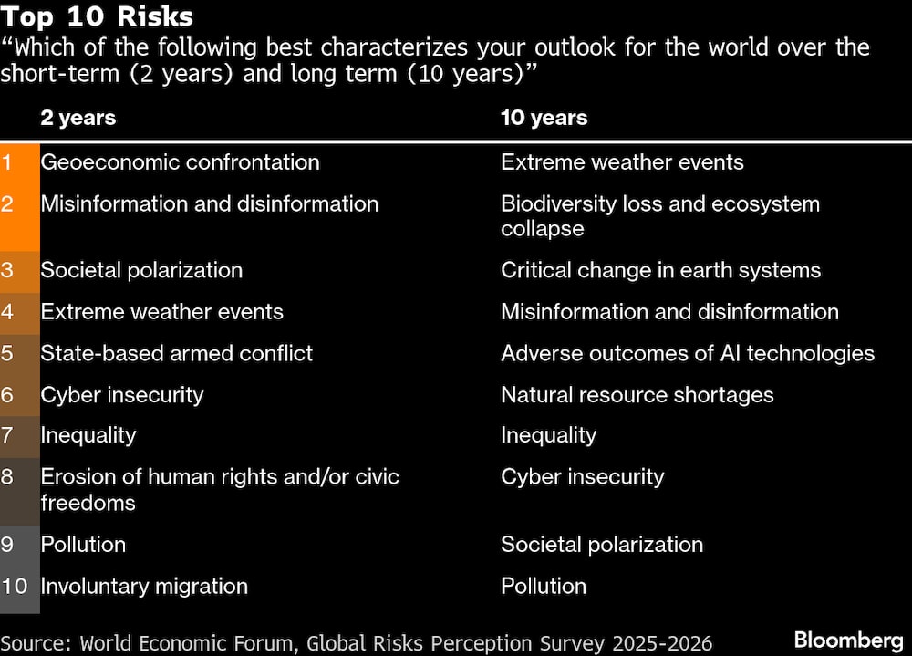 Bloomberg — Un telón de fondo mundial cada vez más amenazado por disputas comerciales y conflictos interestatales es como los encuestados en un sondeo del Foro Económico Mundial ven que se desarrollarán las cosas en 2026.