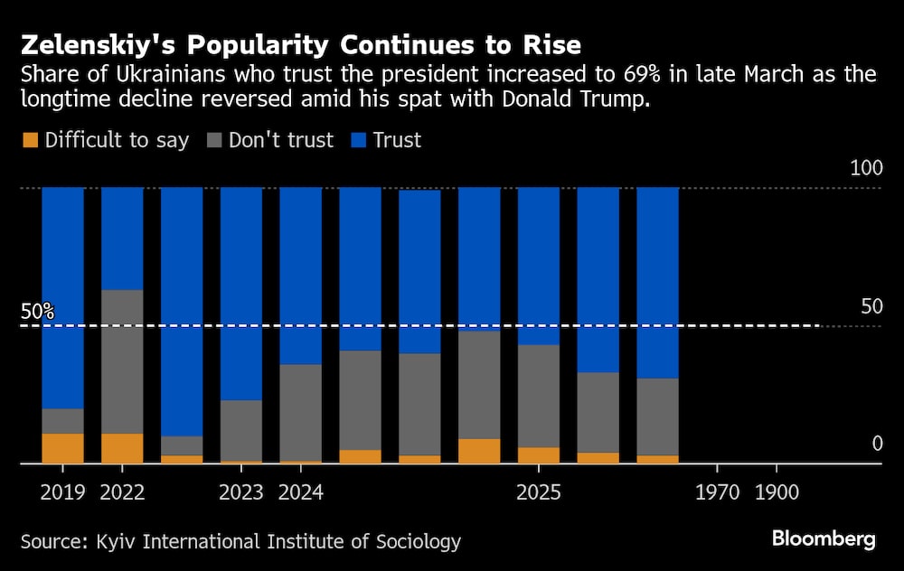 La confianza de los ucranianos en Zelenskiy aumentó hasta el 69%, 2 puntos porcentuales más que a principios de marzo, según una encuesta del Instituto Internacional de Sociología de Kiev (KIIS) publicada en vísperas de la cumbre.