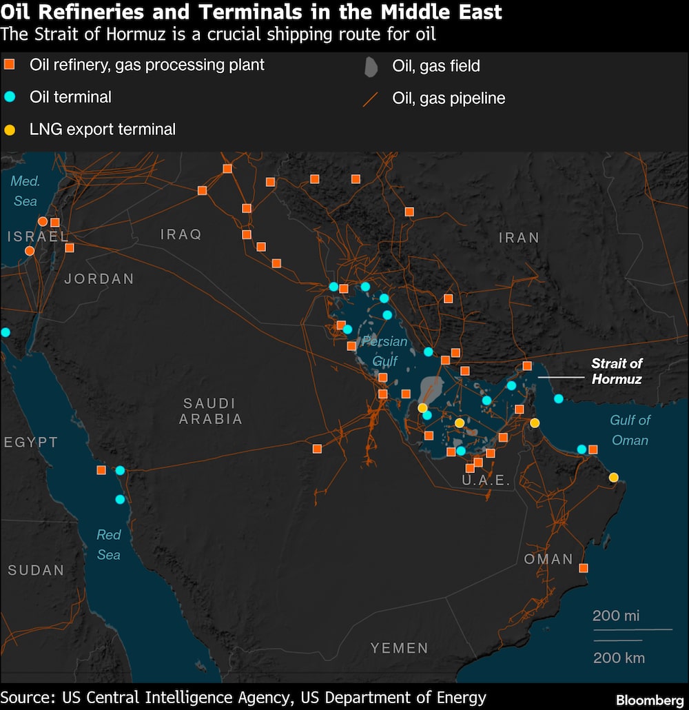 Irán suministra alrededor del 5% del petróleo mundial, y una interrupción completa elevaría el precio en torno a un 20%, según escribieron Ziad Daoud y Dina Esfandiary, de Bloomberg Economics, en un informe antes de que el petróleo comenzara a cotizar en Asia. Además, alrededor del 20% del suministro mundial de petróleo transita por el estrecho de Ormuz, y si se cerrara los precios podrían dispararse hasta US$108 por barril, advirtieron.