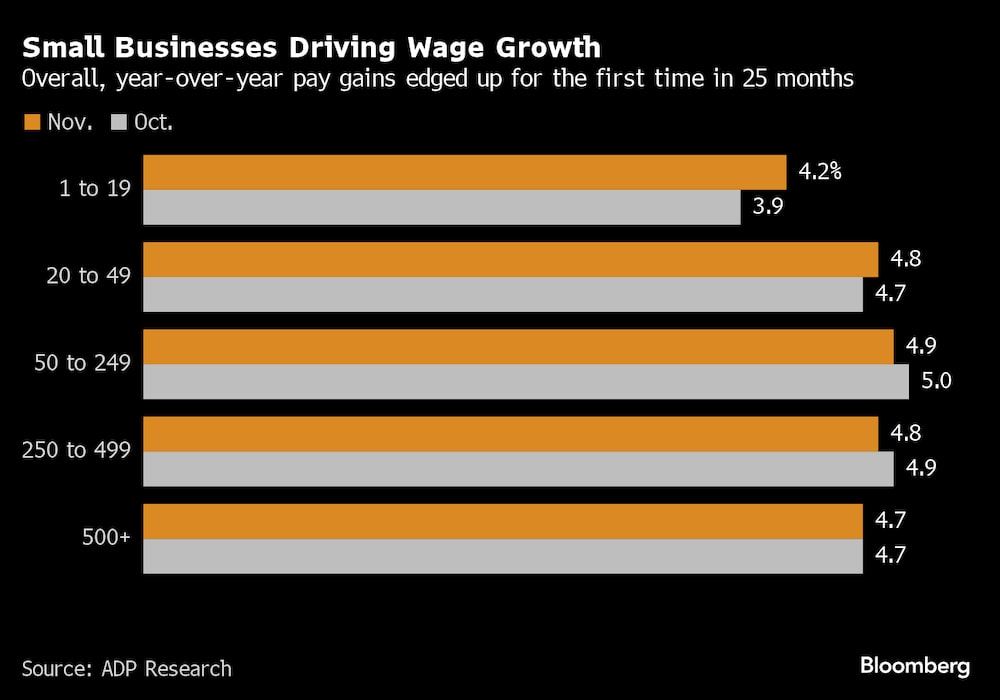 Bloomberg — El crecimiento salarial entre las empresas estadounidenses más pequeñas se aceleró en noviembre por primera vez desde principios del año pasado, según datos del Instituto de Investigación ADP.