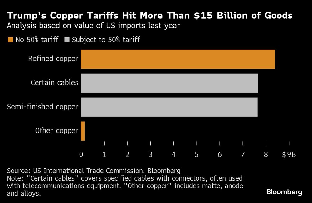 La revelación de aranceles de importación del 50% provocó agitación en el mercado mundial del cobre la semana pasada -incluida una caída récord de los futuros estadounidenses- porque Trump concedió una exención sorpresa a formas clave del metal de alambrón. Pero eso sigue dejando importantes volúmenes comerciales sujetos a aranceles.