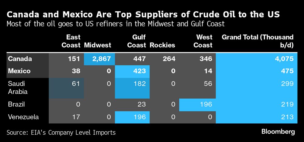 Juntos, Canadá y México suministran siete de cada 10 barriles de petróleo importados por EEUU. La mayoría de ellos van a parar a los fabricantes de combustible del Medio Oeste y algunos también se dirigen al mayor centro de refinado de petróleo del mundo, en la costa del Golfo. A principios de esta semana, el presidente electo Donald Trump dijo que está dispuesto a imponer un arancel del 25% a “TODOS los productos” procedentes de Canadá y México.