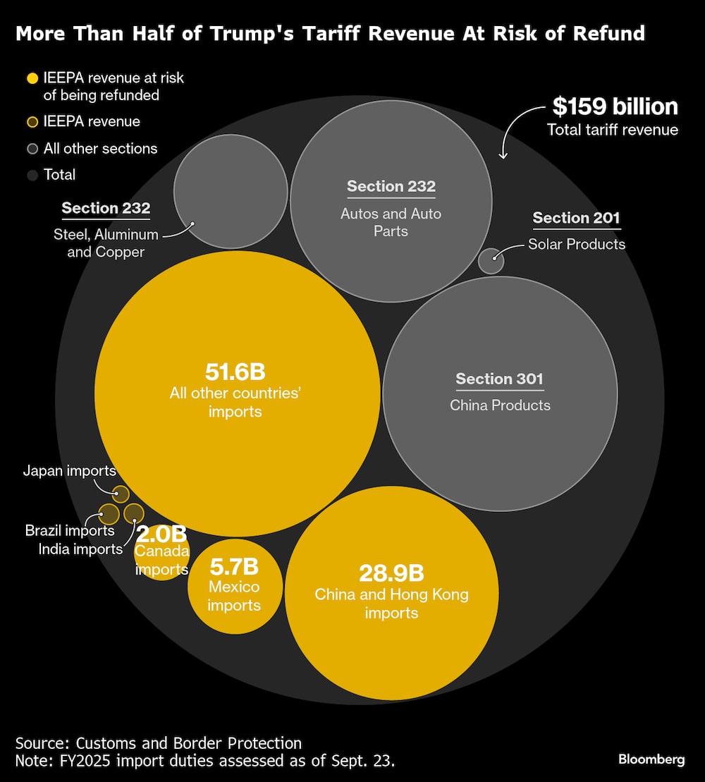 La mayor parte del aumento de los aranceles aduaneros -US$95.000 millones más que el año anterior- se debe a los gravámenes impuestos por Trump a las importaciones procedentes de docenas de economías que entraron en vigor en agosto, según un análisis de Bloomberg Economics. Dos tribunales inferiores ya han dictaminado que Trump no estaba autorizado a imponer aranceles en virtud de la ley que citó: la Ley de Poderes Económicos de Emergencia Internacional.