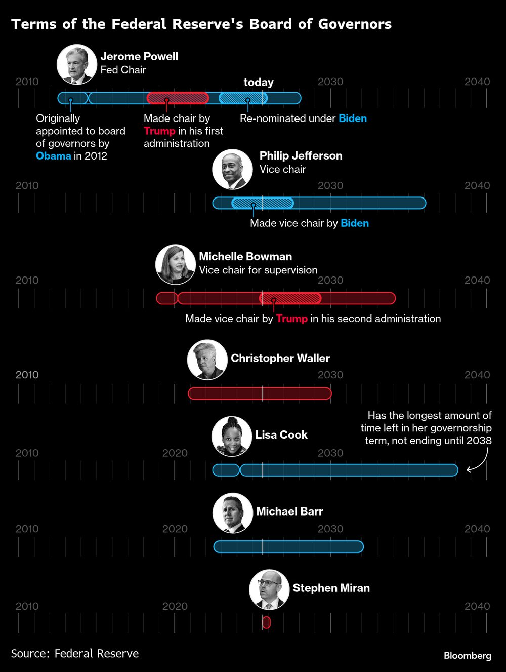 El presidente ha pensado en tener mayoría en el consejo de la Fed a medida que surjan vacantes, y dice que elegirá a un nuevo presidente comprometido con tasas más bajos para sustituir a Powell cuando termine su mandato el año que viene. El secretario del Tesoro, Scott Bessent, que está supervisando ese proceso de selección, se ha vuelto más vocal en sus críticas y ha pedido una “revisión honesta, independiente y no partidista” de toda la institución.