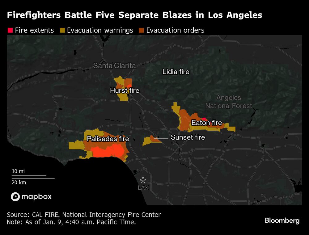 Bloomberg — Los bomberos de Los Ángeles luchan por contener cinco grandes incendios mientras los potentes vientos siguen avivando las llamas que han dejado al menos cinco muertos, diezmado barrios y obligado a evacuar a casi 180.000 personas en el peor desastre natural de la región en décadas.