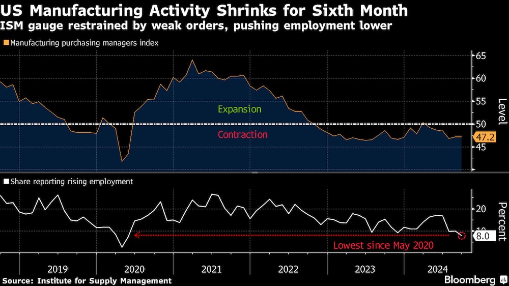 Bloomberg — La actividad manufacturera estadounidense se contrajo en septiembre por sexto mes consecutivo, como reflejo de la debilidad de los pedidos y el descenso del empleo.