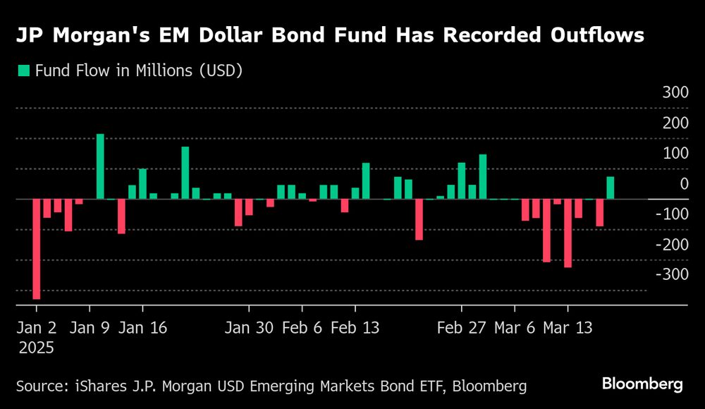 En el centro del recelo intensificado están las preguntas sobre si los aranceles a la importación de Donald Trump avivarán la inflación y mantendrán fuerte al dólar, o si empujarán a la mayor economía del mundo a la recesión y arrastrarán a otras con ella. El rendimiento extra que exigen los inversores para poseer bonos de mercados emergentes frente a los bonos del Tesoro estadounidense alcanzó un máximo de cuatro meses en marzo, según muestran los datos recopilados por Bloomberg.