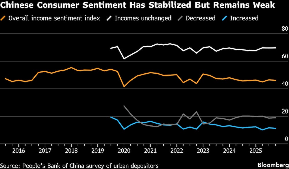 “Los últimos datos pintan un panorama mixto, con un debilitamiento de la demanda de crédito y de las expectativas de precios de los hogares, pero una mejora marginal en el sentimiento del empleo”, dijeron en una nota los economistas de Goldman Sachs Group Inc. dirigidos por Yuting Yang. “Sin embargo, menos hogares planeaban gastar más en artículos de gran valor, lo que sugiere un desvanecimiento continuado del programa de intercambio de bienes de consumo subvencionado por el gobierno en el cuarto trimestre”.