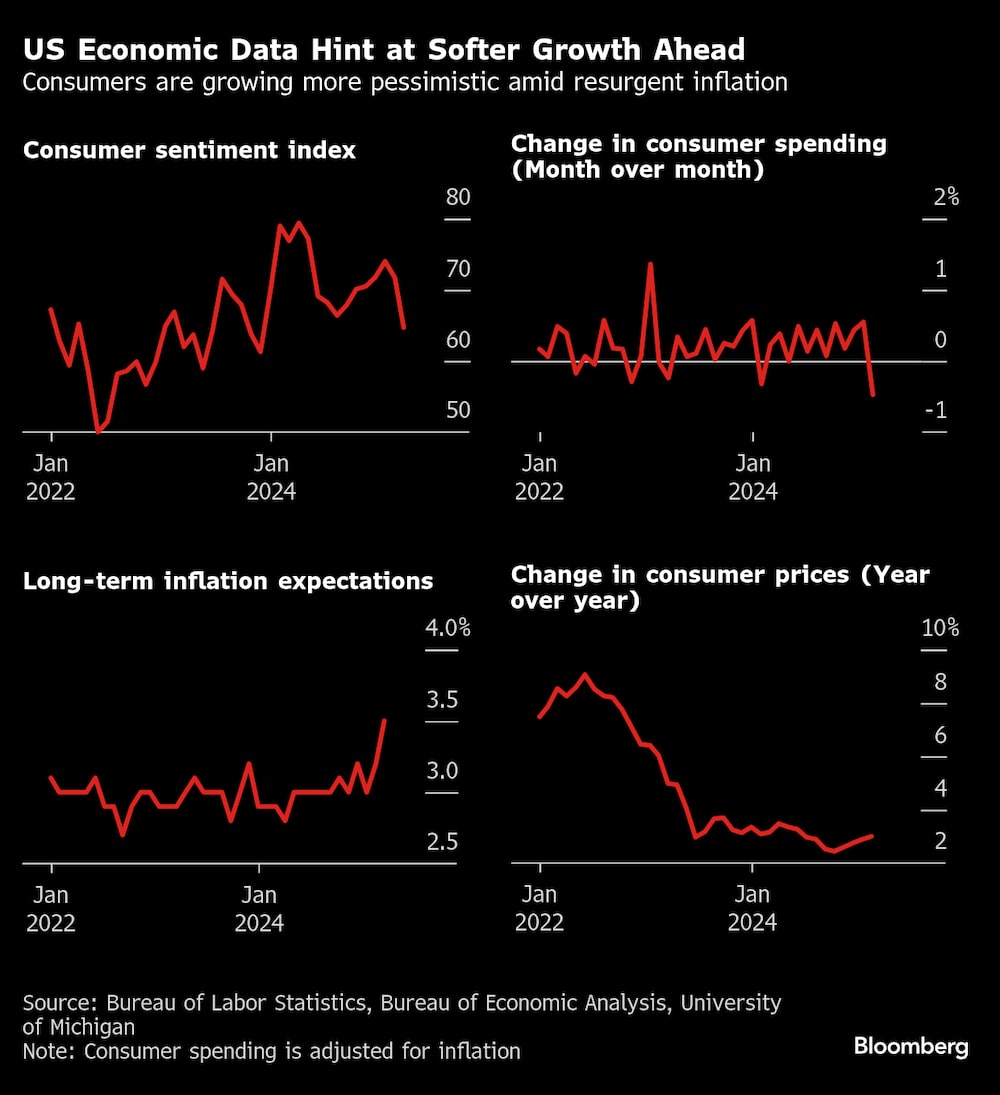 El gasto de los consumidores registró en enero la mayor caída en casi cuatro años y la confianza se ha debilitado. La actividad de las fábricas retrocedió el mes pasado, mientras que un indicador de los precios pagados por los materiales se disparó hasta alcanzar el nivel más alto desde junio de 2022.