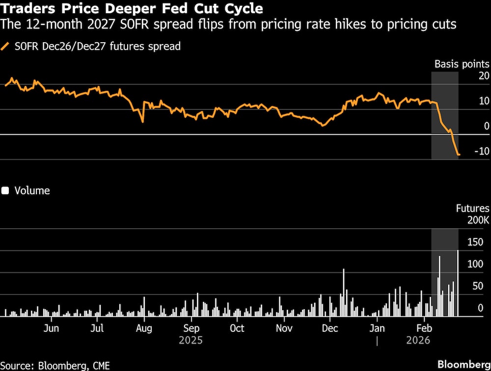 El diferencial SOFR a 12 meses de diciembre de 2026 a 2027 cayó a negativo el viernes y la inversión se profundizó el martes a menos 8 puntos básicos, en una señal de que los inversores han pasado de las subidas de precios en 2027 a los recortes de precios. En la sesión del lunes se negoció una cantidad récord de algo más de 150.000 en el diferencial a 12 meses.