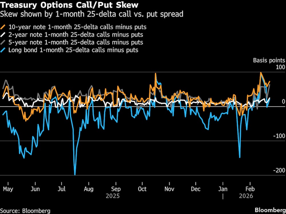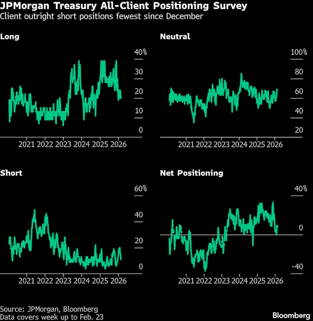 Mientras tanto, en el mercado al contado, los operadores están mostrando una falta de convicción sobre cómo posicionarse en los bonos del Tesoro. La última encuesta de clientes de JPMorgan que cubre la semana hasta el 23 de febrero mostró la mayor cantidad de posicionamiento neutral desde finales de 2024.