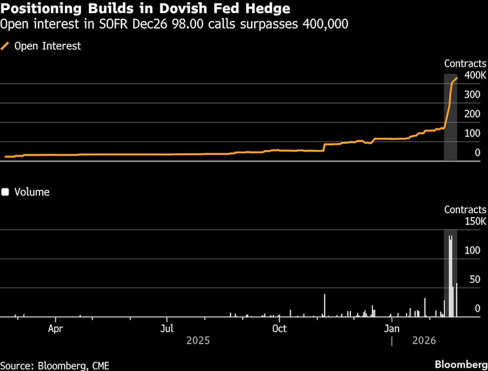 En el mercado de opciones SOFR, se observa un tono moderado similar en las operaciones que buscan cubrir la posibilidad de múltiples recortes de tasas este año. Estas operaciones repuntaron el martes, con una posición que busca cubrir una caída de la tasa de interés oficial hasta el 2% a finales de año, aumentando su tamaño. El interés abierto en las opciones de compra de diciembre a 98,00 se disparó a más de 400.000 esta semana. El mercado de swaps actualmente estima una tasa de interés de la Fed en torno al 3,1% —o algo más de dos recortes de 25 puntos básicos— para finales de año, unos 110 puntos básicos por encima del precio de ejercicio de las opciones.