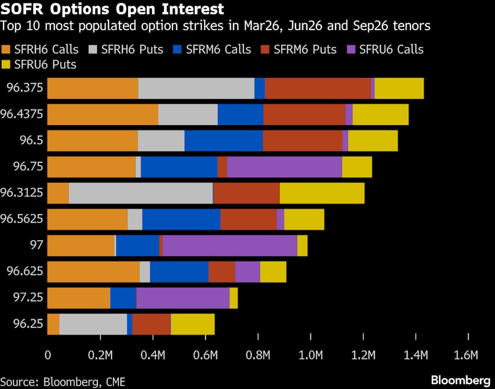 En general, el precio de ejercicio más activo en los plazos hasta septiembre 26 es el nivel de 96,375, donde se mantiene un gran interés abierto en opciones de compra, venta y venta de marzo 26. Las operaciones recientes en torno a los precios de ejercicio más altos han generado demanda de opciones de compra SFRH6 de 96,375/96,4375/96,50 y opciones de venta SFRM6 de 96,5625/96,4375/96,375 1x3x2.